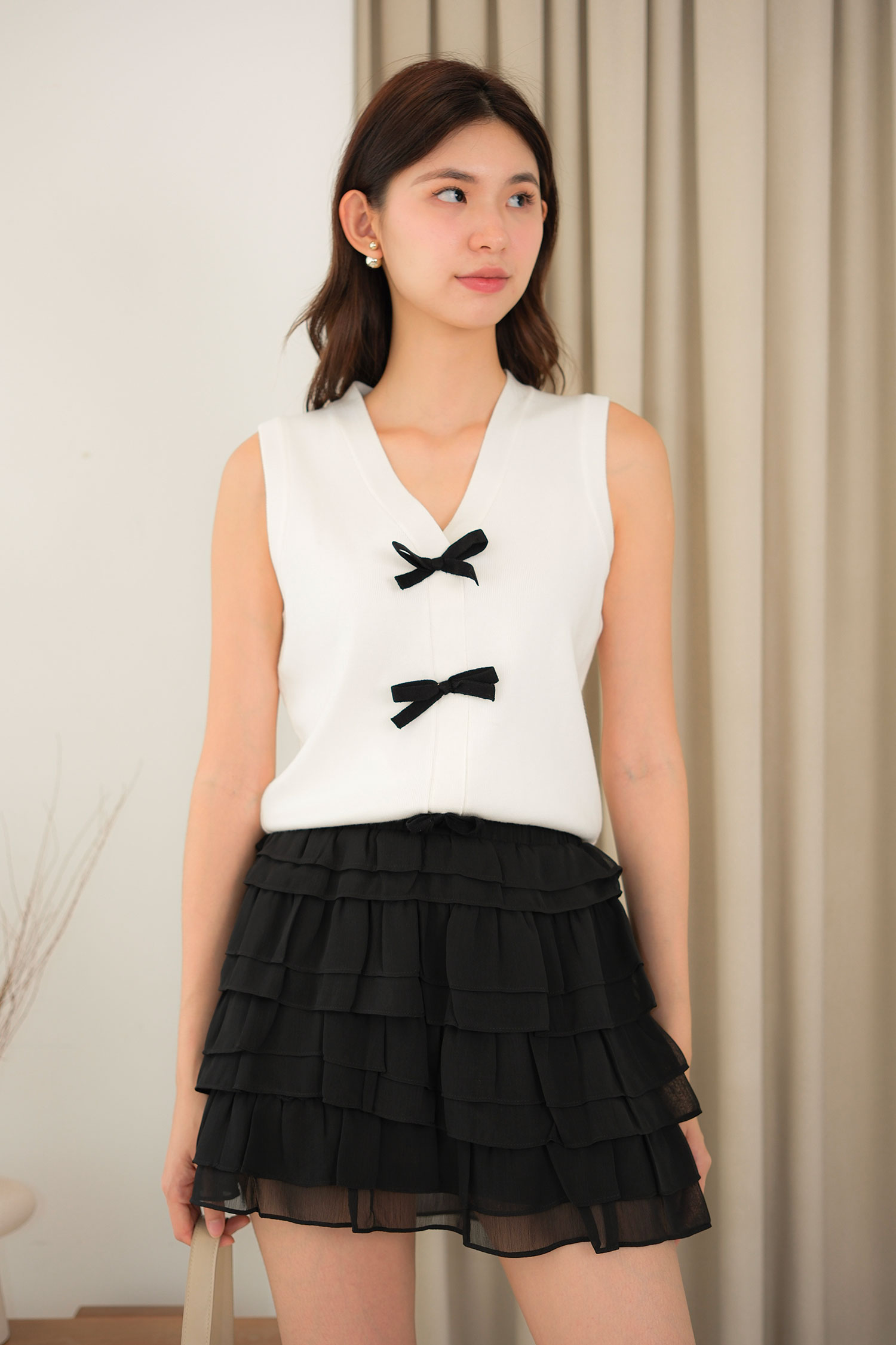 Sleeveless Back ribbon deco Front bottom open slit Ribbed textured Material: Cotton knit elastane INCHES Free Size BUST 34-40 LENGTH 19 *Model wears S size *Model height 175 cm