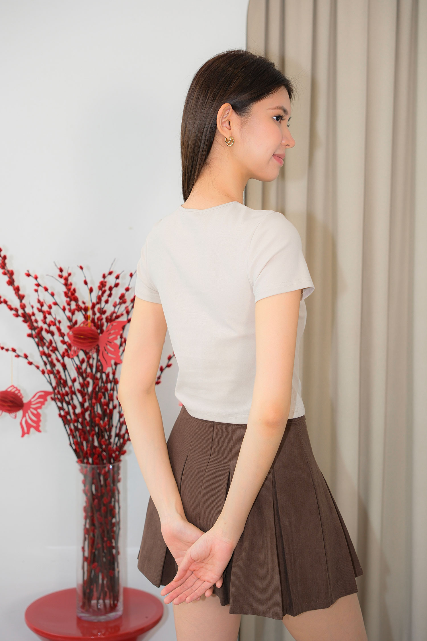 Inner short Front & back pleated Back center conceal zip Material: Corduroy INCHES S M L WAIST 25 27 29 HIP 36 38 40 LENGTH 13.5 13.5 14 * Model wears S size * Model height 175 cm