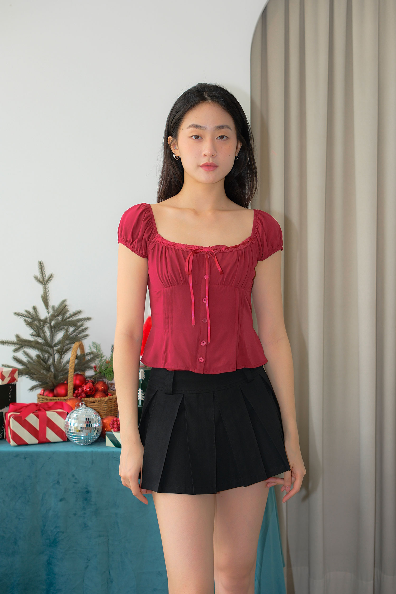 Body fit Round neck Asymmetrical side pleated Stretchable Material: Cotton elastane INCHES S M SHOULDER 12.5 13 BUST 28-38 30-40 SLEEVE 5 5.5 LENGtH 20.5 21 * Model wears S size * Model height 175 cm